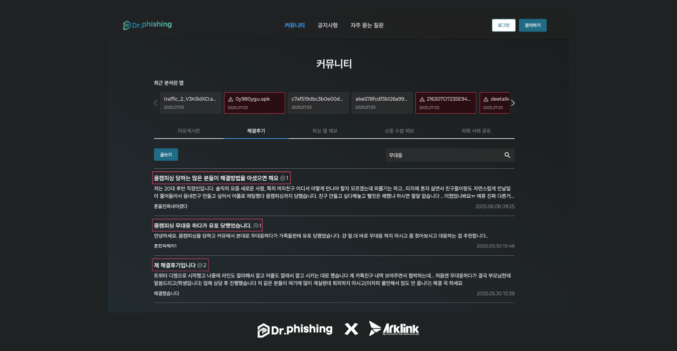 닥터피싱 사이트에는 △악성 앱 분석 △피해 사례 공유 △해결 후기 △피싱 앱 제보 등 다양한 게시판이 마련돼 있어, 실제 피해 사례와 대응 사례를 쉽게 확인할 수 있다. 특히, 초기 대응 없이 무대응으로 방치한 피해자들의 피해가 심각하게 확대되는 사례가 다수 공유되고 있어, 전문가들은 각별한 주의를 당부하고 있다.